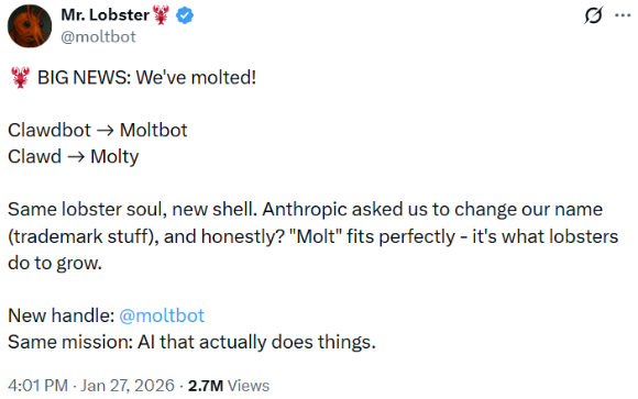 昨天,Clawdbot 正式改名为 Moltbot。打开官网,可以看到龙虾图标下面的名字已经换了。