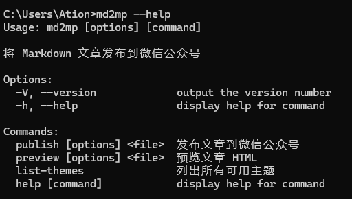 node js开发,是个 CLI (命令行工具),命令为:md2mp publish <MarkDown 文件>; - CLI 使用示例: