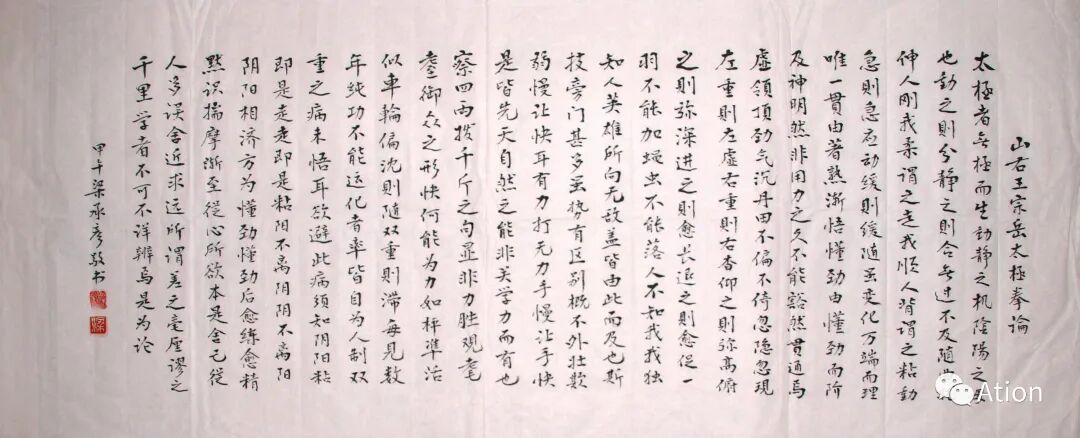 太极者,无极而生,动静之机,阴阳之母也。动之则分,静之则合。无过不及,随曲就伸。人刚我柔谓之走,我顺人背谓之粘。动急则急应,动缓则缓随。虽变化万端,而理唯一贯。由招熟而渐悟懂劲,由懂劲而阶及神明。然非用力之久,不能豁然贯通焉。虚领顶劲,气沉丹田。不偏不倚,忽隐忽现。左重则左虚,右重则右杳。仰之则弥高,俯之则弥深,进之则愈长,退之则愈促。一羽不能加,蝇虫不能落,人不知我,我独知人。英雄所向无敌,盖皆由此而及也。